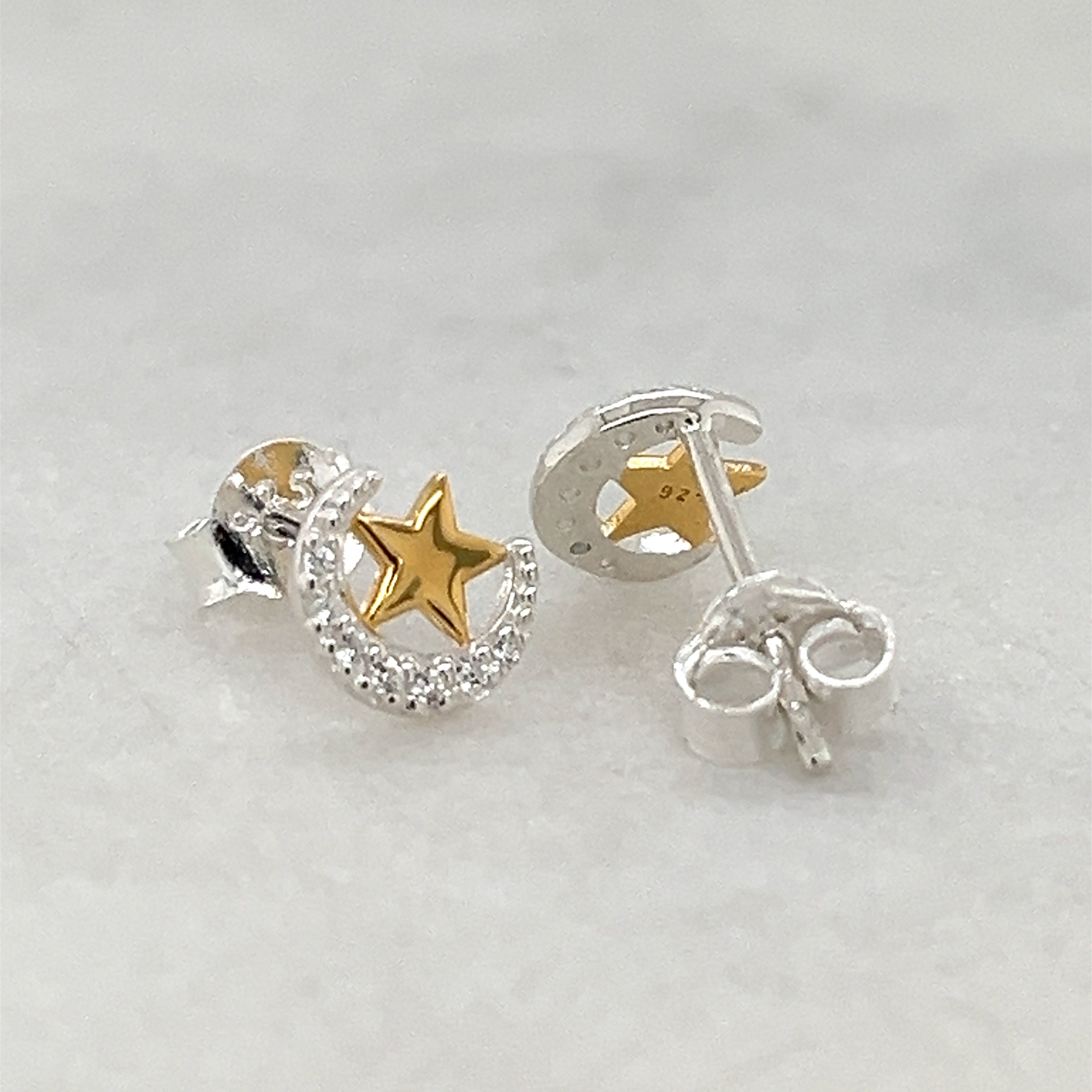 Gorgeous new moon and star studs in sterling silver, set with sparkling white cubic zirconia stones.