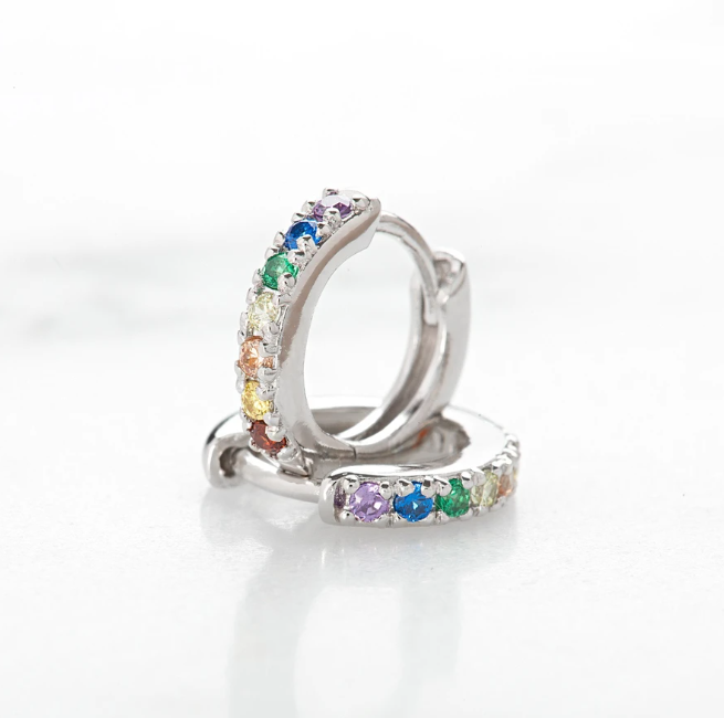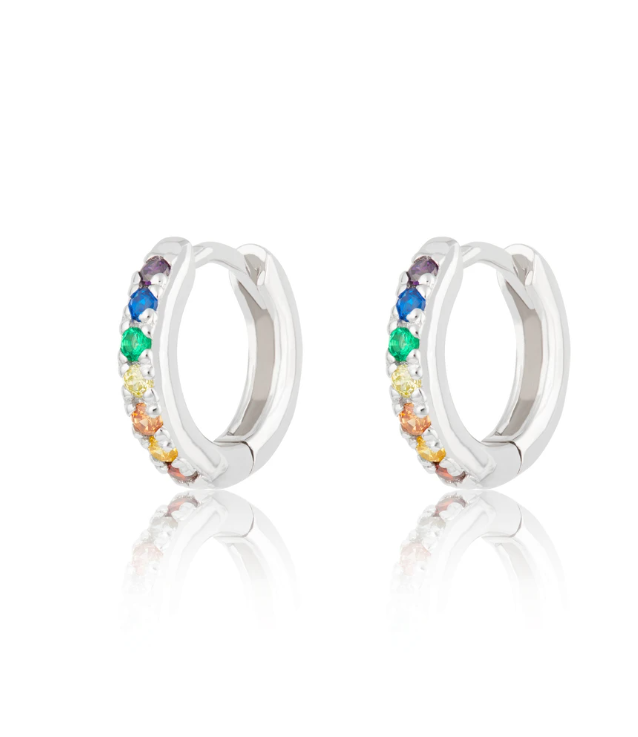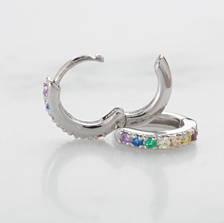 Rainbows on your ears! These sparkling multi coloured huggie hoop earrings can be worn everyday as a subtle sparkly addition for your ears. Choose from silver or gold plated sterling silver.
