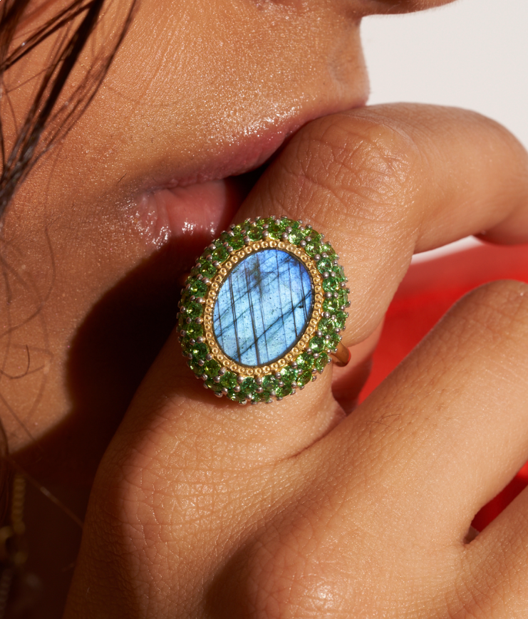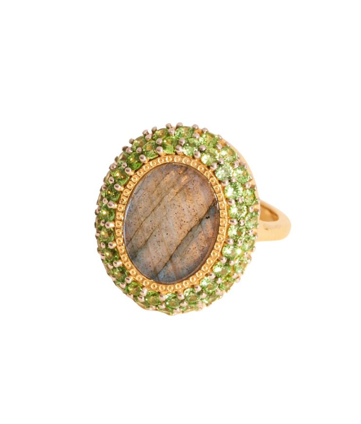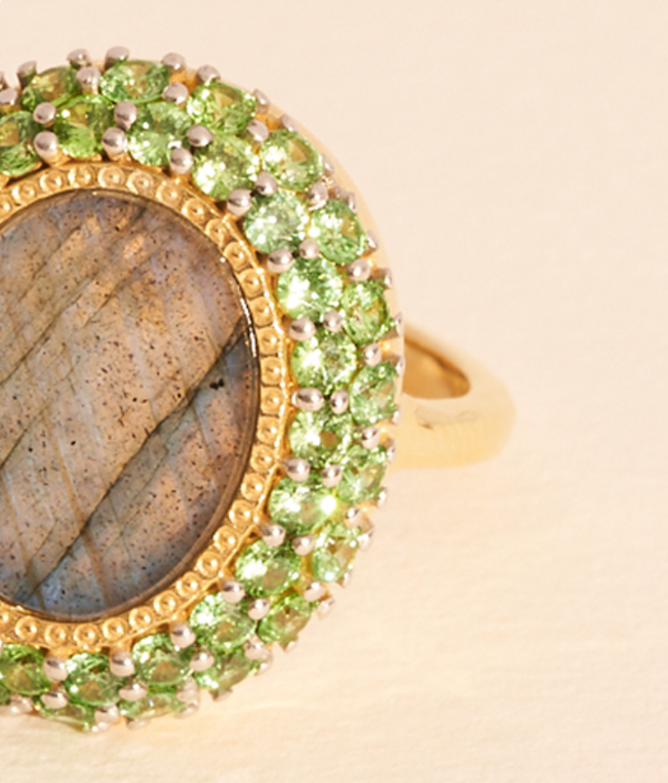 Radiant and luminous with its myriad of colorful zircons, The Mirage ring in Labradorite or Aventurine is as precious as an antique jewel! Handcrafted by talented artisans, it encapsulates exceptional craftsmanship that is reflected in its meticulousness details. Cutting, mounting, polishing, setting, and gilding: each step is unique and handmade so that this exceptional piece can enhance your everyday outfits.