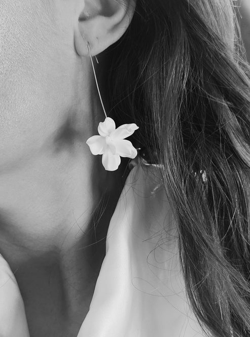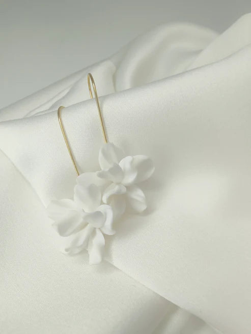 A pair of delicate handmade clay flowers suspended from a contemporary 18ct gold plated long hook.