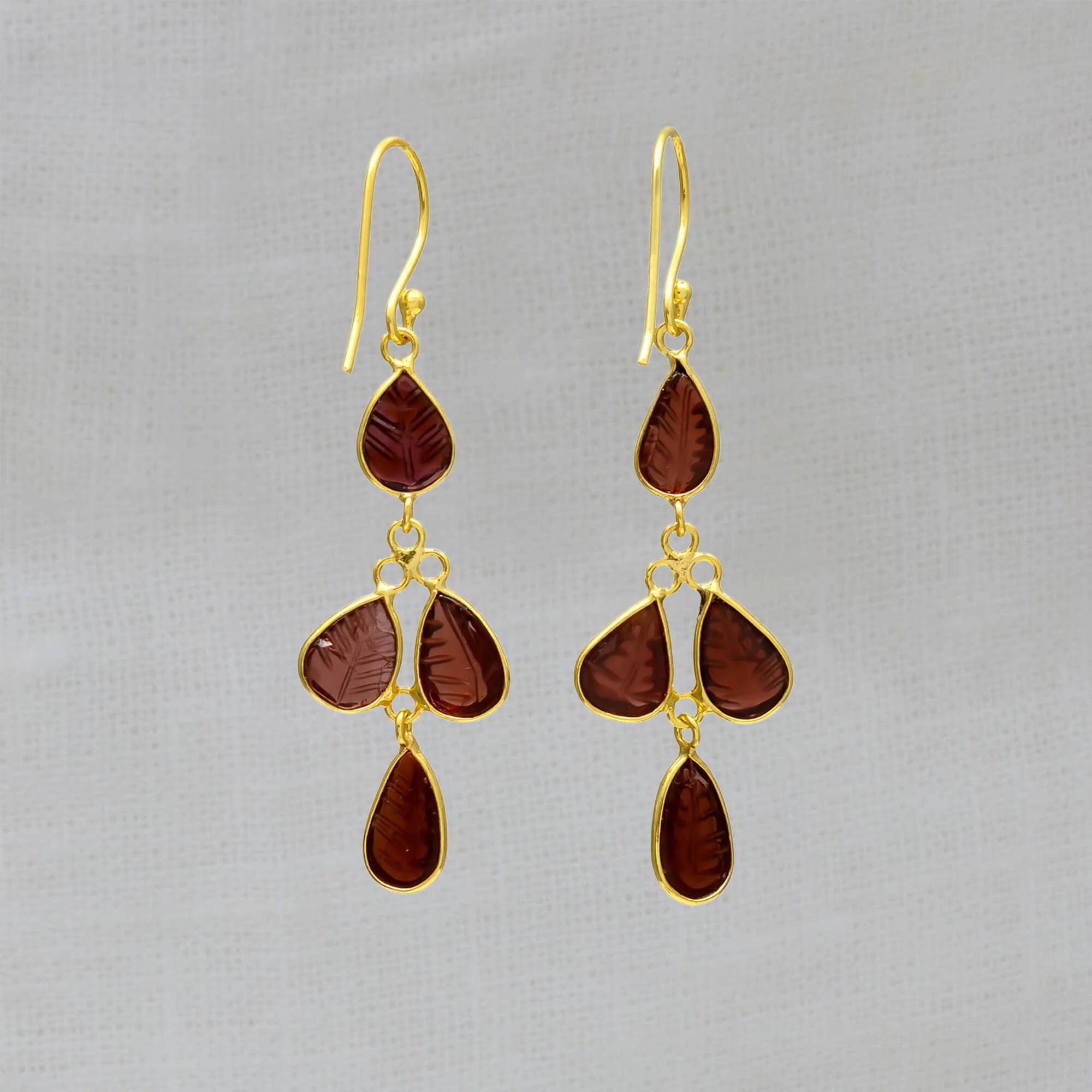 Beautiful Garnet gemstones that have been hand carved with a leaf motif adorn these 18ct gold vermeil chandelier earrings. The leaf shaped green emerald gemstones have striking natural markings and inclusions and have a lovely gentle movement when worn. The earrings are crafted in 18ct gold plated silver, with a simple hook fitting.