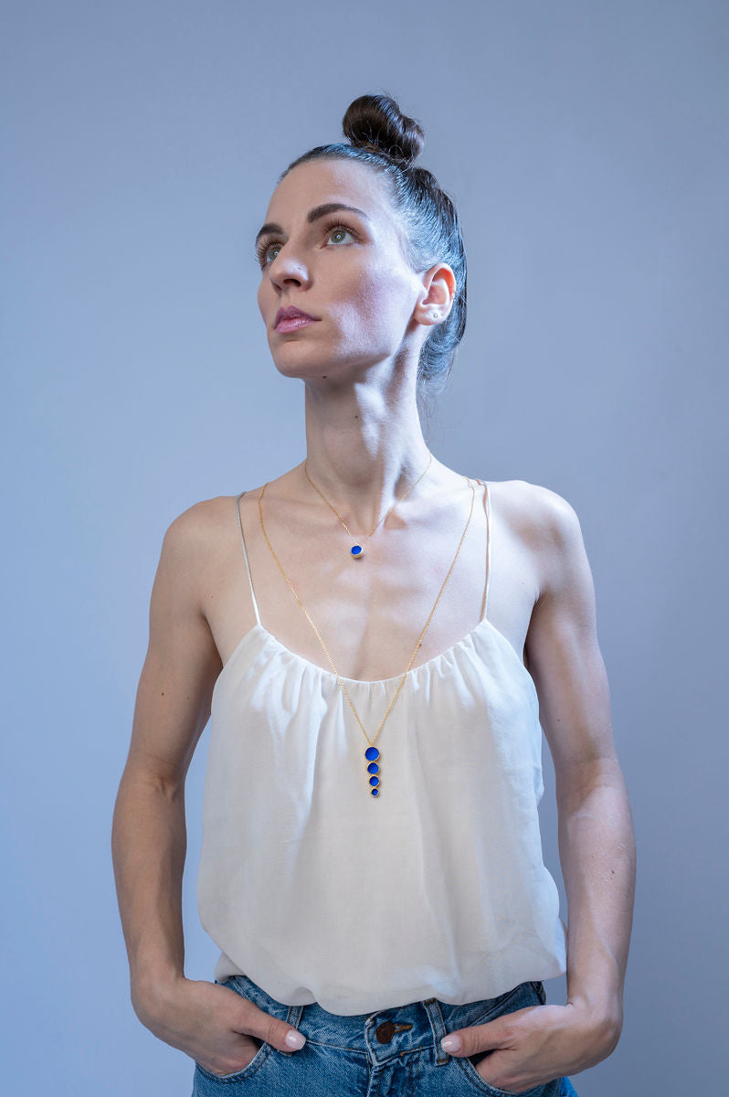 Hand-painted round pendant by Greek designer Georgia Charal in a vivid blue tone. Modern, feminine and easy to wear. The intense Greek-blue hue evokes the shimmering Mediterranean Sea and summer sky.