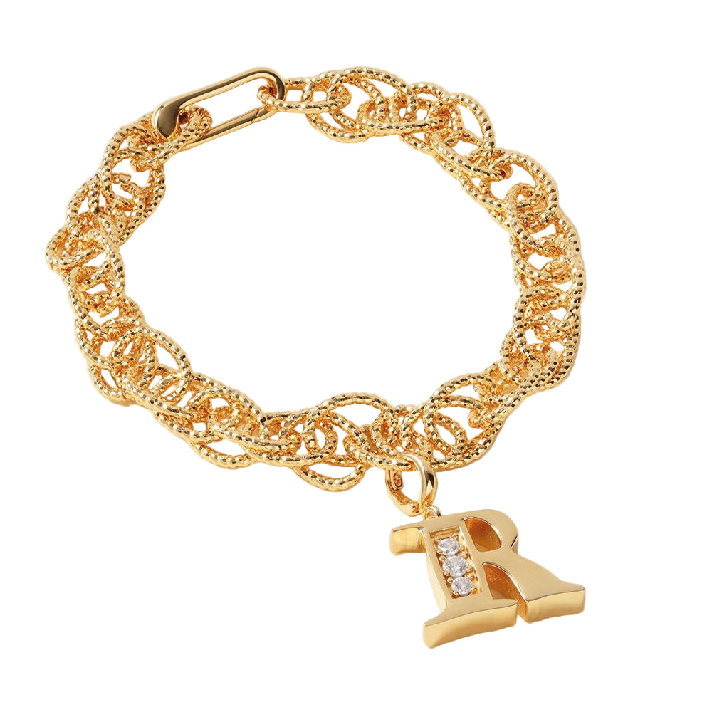 Double link bracelet with diamond texture. 24ct gold plated bronze. Can be worn alone or combined with the Rebecca My World Charms.