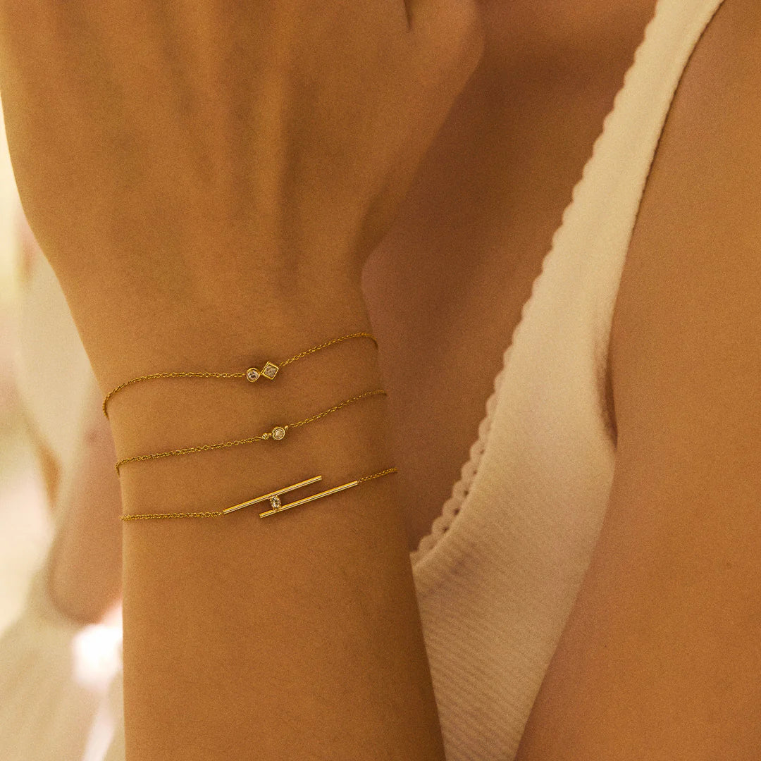 BDM Studio Paris Scarlett Bracelet. 24ct gold-plated to ensure a long life and set with a clear Swarovski stone. They contain no allergenic metals, only brass, copper, and gold. Matching earrings and necklace also available in the same range.