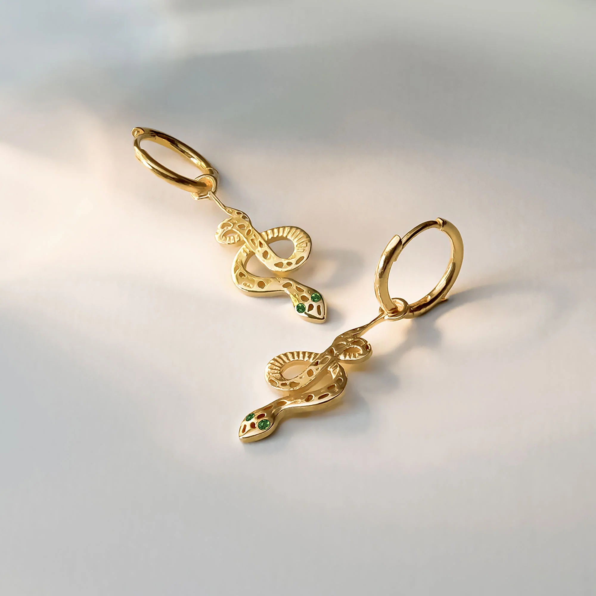 Make a powerful statement with these Gold Serpentina Huggie Hoops. Featuring genuine emerald eyes representing love, renewal, and healing, these gold-plated snake earrings are rich in symbolism. Offering all-day comfort, the serpent motif embodies strength and transformation.
