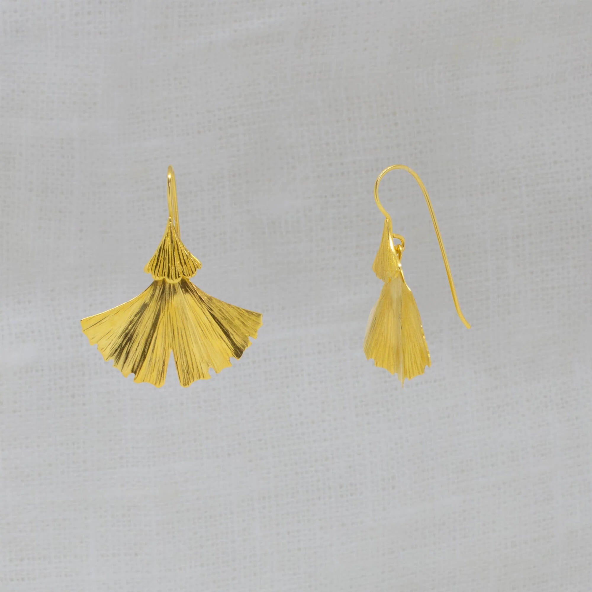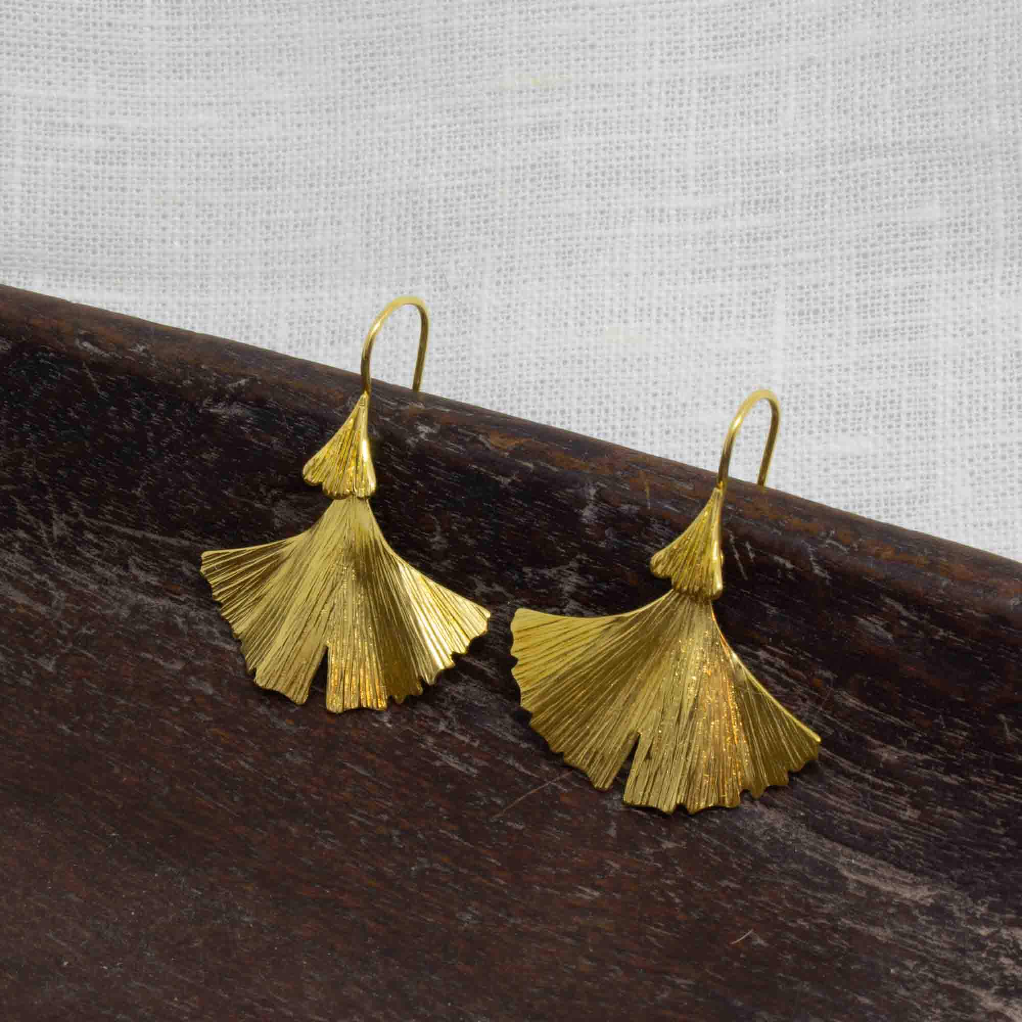 These fan shaped drop earrings feature a delicate ginkgo leaf design, intricately textured to capture the leaf's natural contours. The earrings are finished with leaf shaped hooks, which allow for natural movement when the earrings are worn.